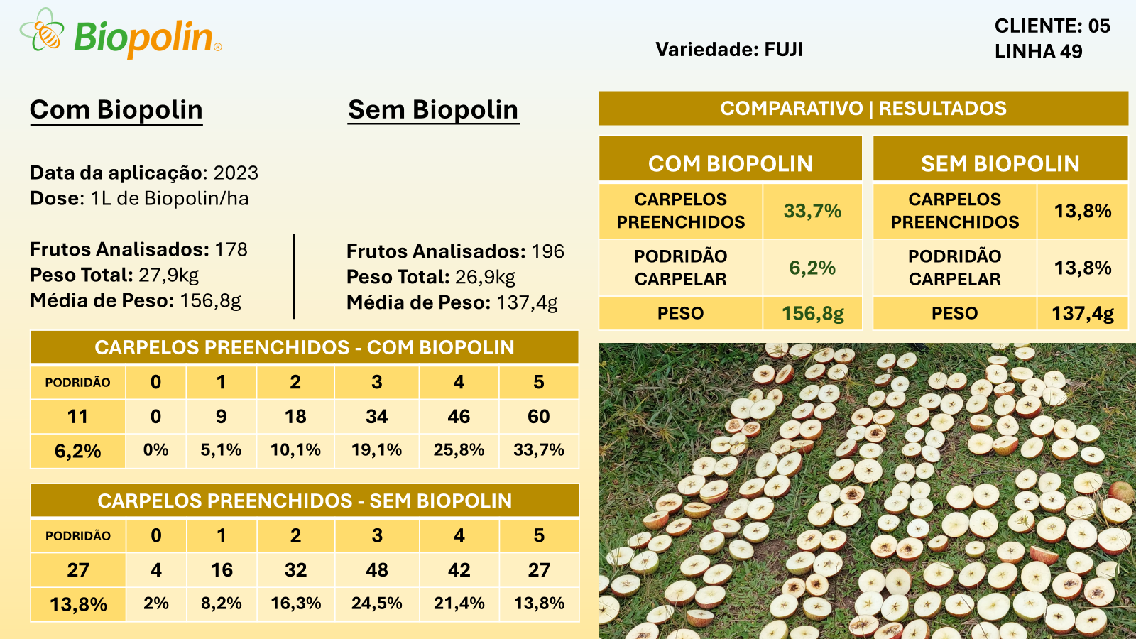 A safra 2023/2024 foi desafiadora para os produtores de maçã, com chuvas durante o período de floração, superando 800 mm acumulados. Apesar das dificuldades, quando as abelhas puderam trabalhar, a presença foi significativamente maior nas áreas tratadas com Biopolin, resultando em uma polinização eficaz.